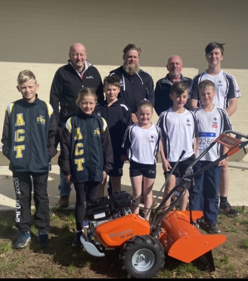 Cooma Ex-Services Club present our new rotary tiller to Cooma Athletics Vice President, Mathew Jamieson, and some of the athletic’s club athletes.